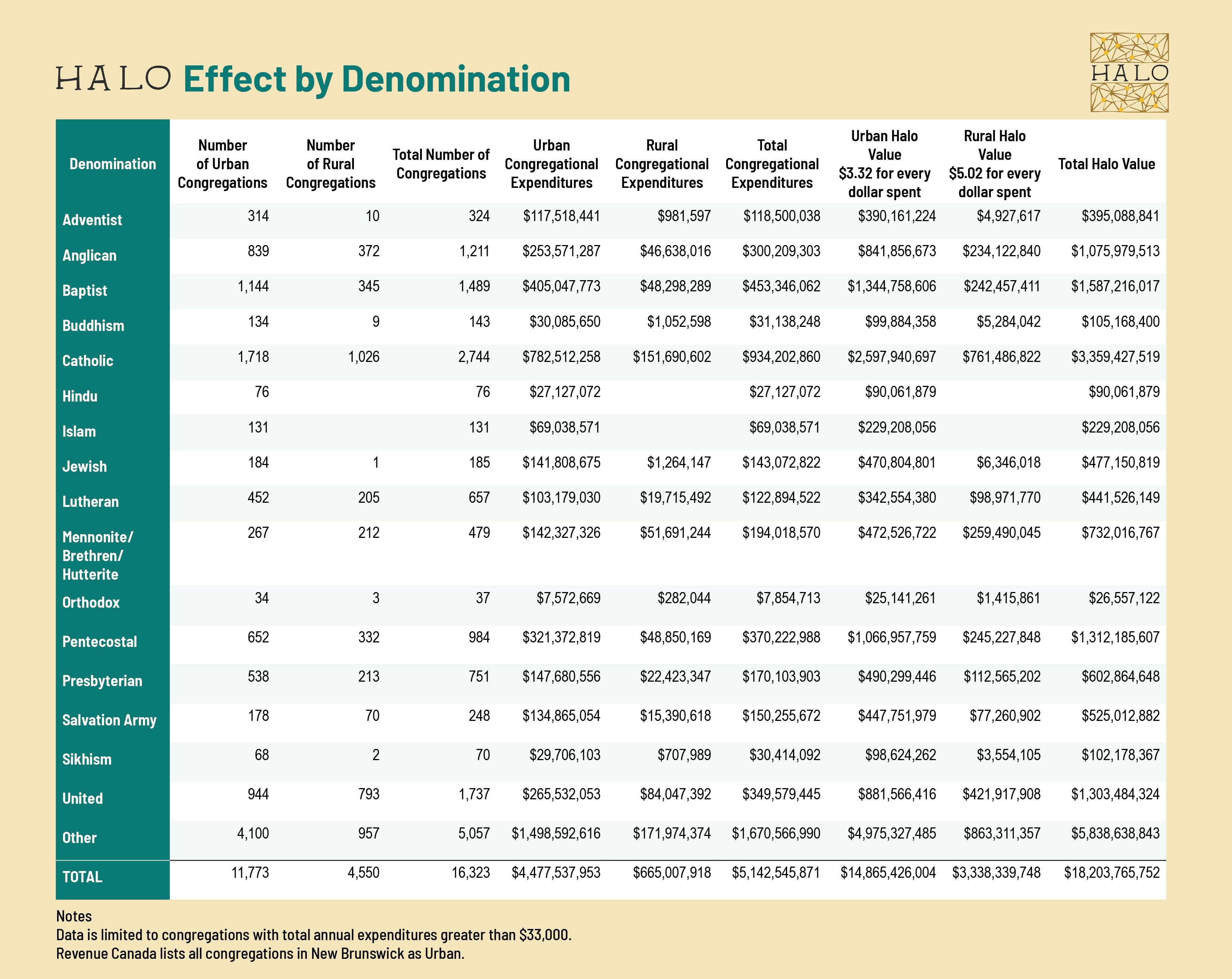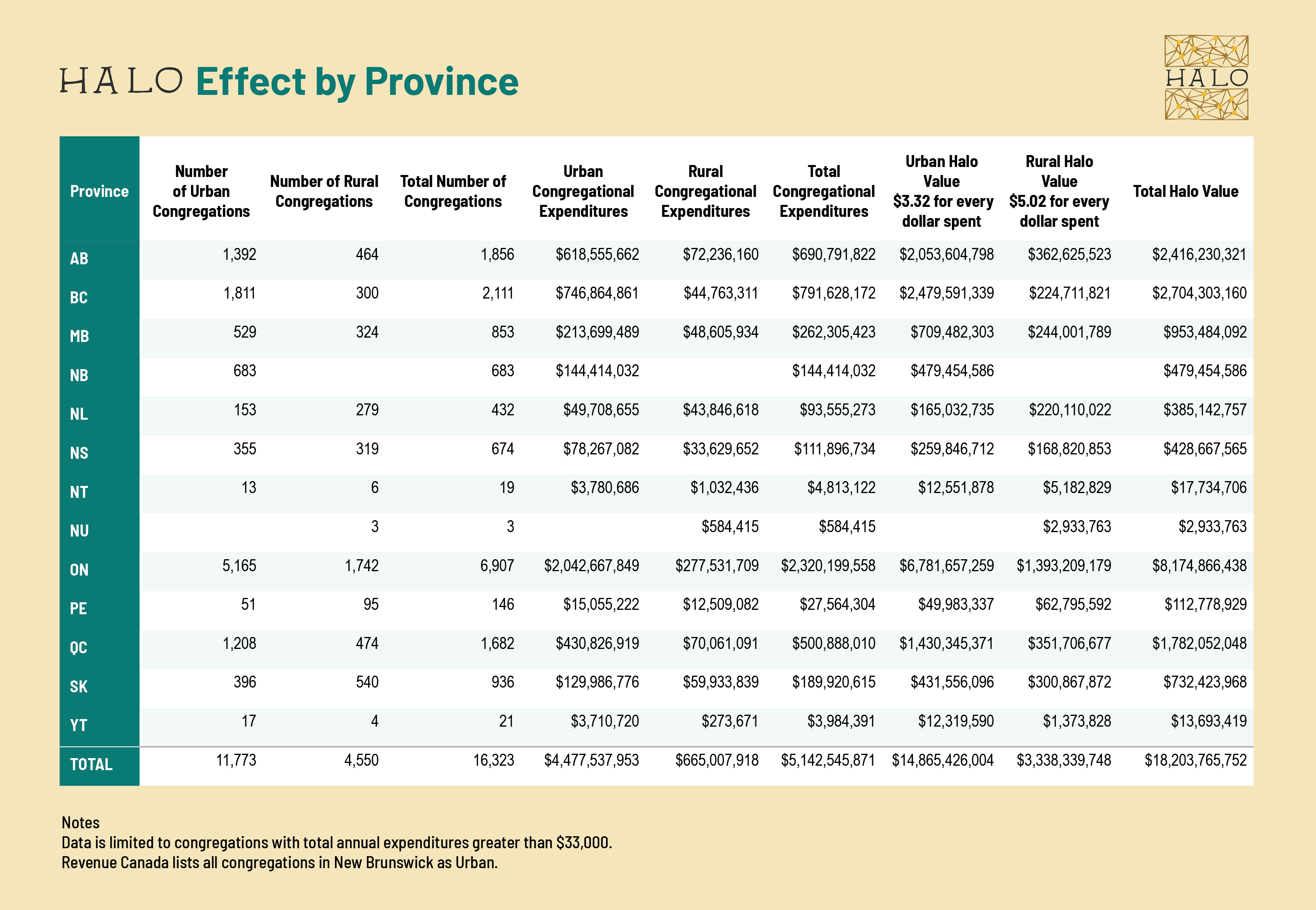 Halo Effect for Canada as a whole is currently estimated to be $18.2 billion. Although religious congregations do not exist for the purpose of benefiting the economy, their economic benefit is in fact significant. Furthermore, if governments or other agencies had to replace the programs and services that congregations provide to their local communities, the cost would be immense.